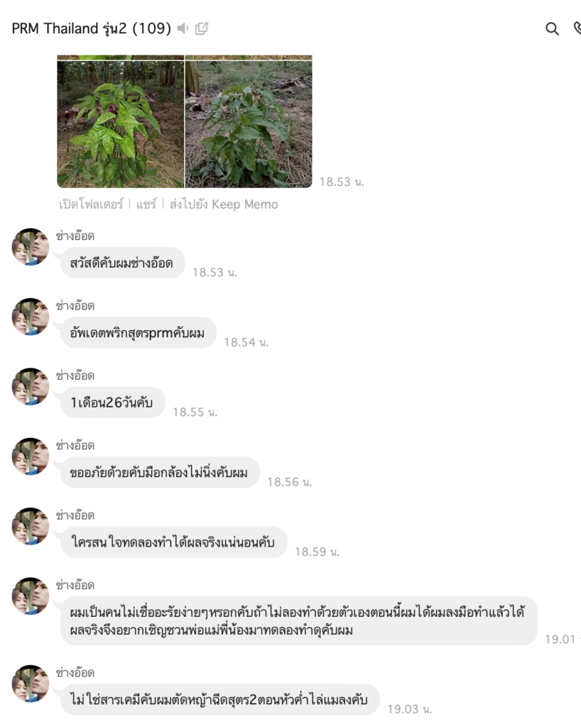 ตอนนี้ใช้สูตร PRM มาแล้ว 1 เดือน 26 วัน ไม่ใช้สารเคมี ตัดหญ้าแล้วฉีดสูตร 2 ช่วงหัวค่ำเพื่อดึงดูดแมลง เห็นผลจริงจึงอยากชวนคนในครอบครัวมาทดลองทำดู